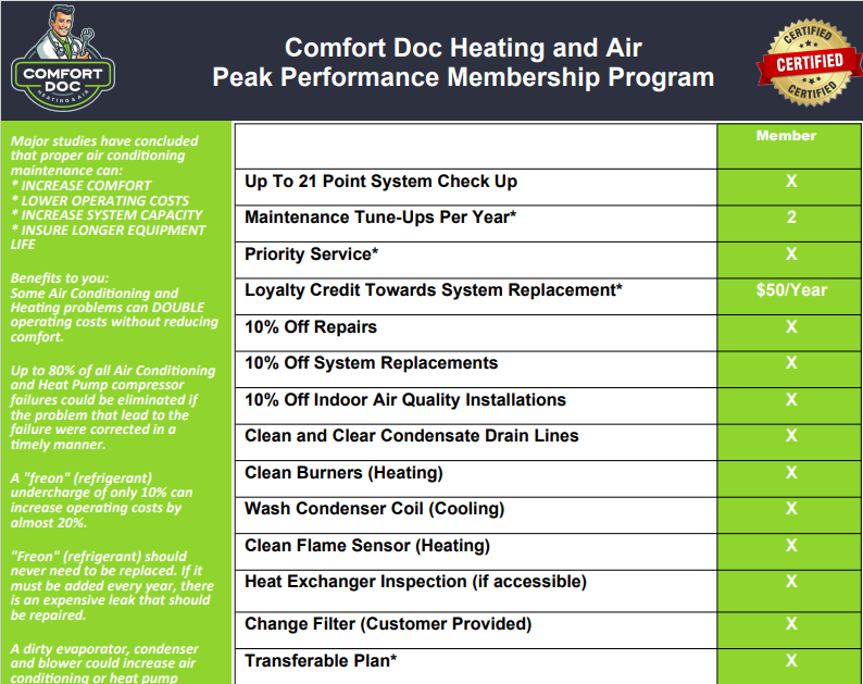 An AC maintenance membership will offer you priority service. Comfort Doc expert technicians are trained to handle any emergency promptly and professionally. Don’t risk getting stuck without AC when it is most needed. Sign up for an AC Maintenance Membership today.